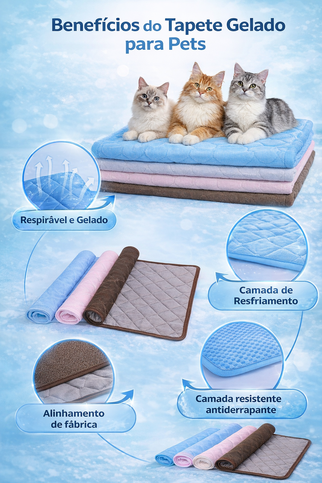 O Tapete Gelado é produzido com fibras especiais de resfriamento, que absorvem o calor corporal do pet e ajudam a manter uma sensação agradável mesmo nos dias mais quentes.